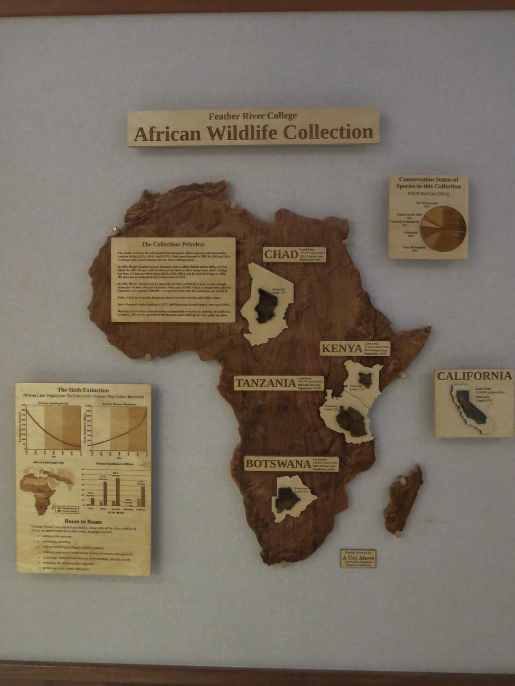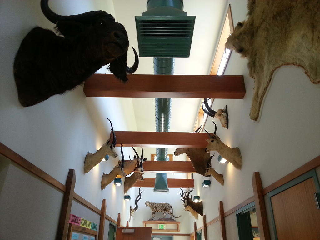 In 2015, two amazing collections of African wildlife were donated to FRC by Berger and Carole Benson and the Jim Codding Family from their safaris to Kenya Chad, Tanzania, Botswana, and South Africa in the 1950s, 1960s and 1970s. The exhibit, housed in the Science Building, contains 48 individuals from 34 species and is open to the public. "A Cut Above" sign company donated a beautiful interpretive sign that hangs in the hallway and tells many stories about the collection. Click on a photo to see more.